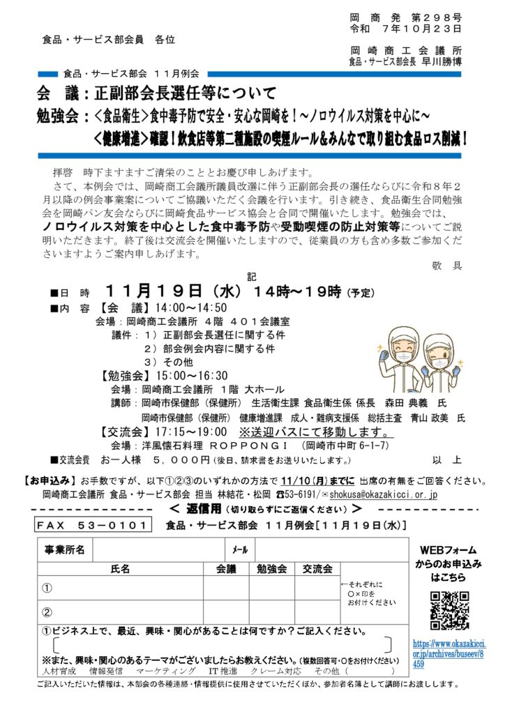 さて、本例会では、岡崎商工会議所議員改選に伴う正副部会長の選任ならびに令和8年2月以降の例会事業案についてご協議いただく会議を行います。引き続き、食品衛生合同勉強会を岡崎パン友会ならびに岡崎食品サービス協会と合同で開催いたします。終了後は交流会を開催いたしますので、従業員の方も含め多数ご参加くださいますようご案内申しあげます。