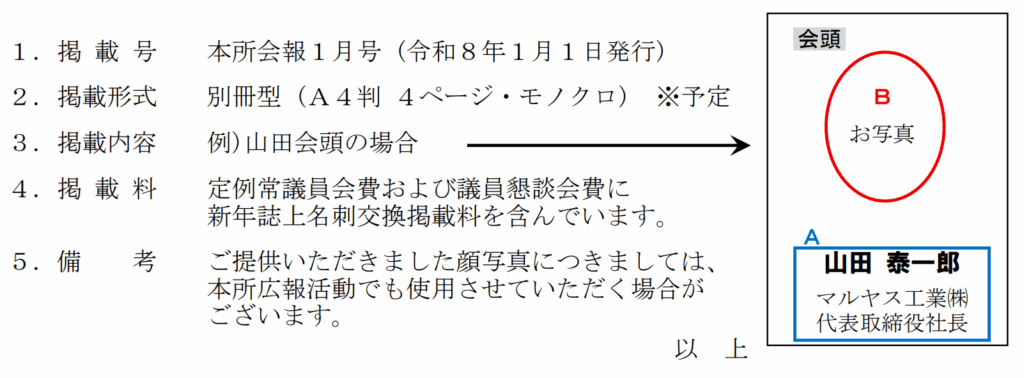 役員ならびに議員全員による「新年誌上名刺交換」を下記の要領で実施させていただきたく存じます。