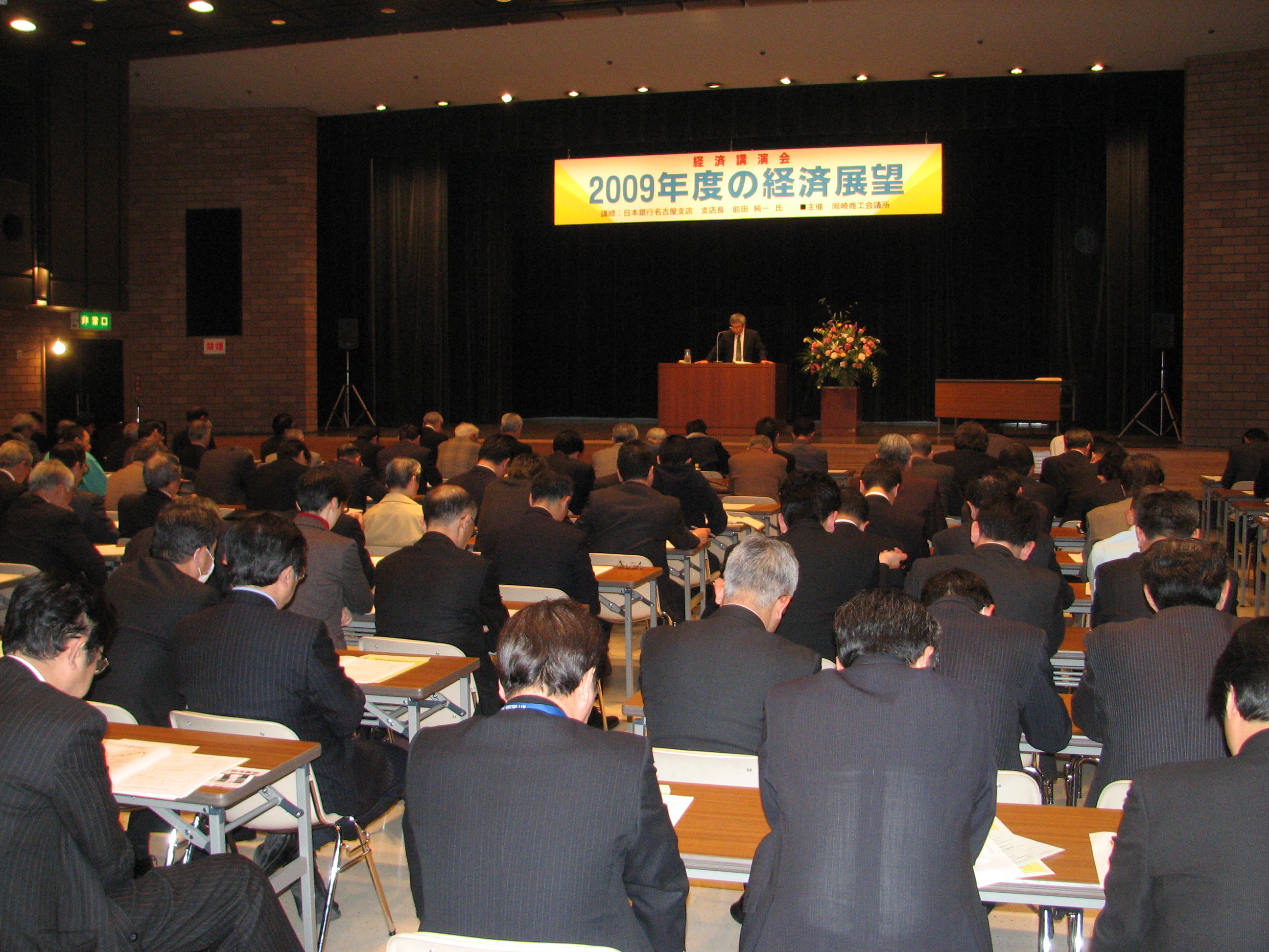 3月25日(水)、本所大ホールにて本所会員企業はじめ160名が参加するなか、この3月より名古屋支店長に着任された日本銀行名古屋支店 支店長 前田純一氏をお迎えし、「2009年度の経済展望」についてご講演をいただきました。 ●2008年度経済の回顧として、 ・わが国経済の動向 −夏場までの景気減速とその背景 −秋以降の急激な景気変調とその背景 ・東海地域の経済 −全国を上回る景気下降の拝啓 −企業の資金繰り動向 ●2009年度経済の展望として、 ・当面の注目点 −在庫調整の進捗状況 −設備投資圧縮と雇用・所得環境悪化の影響 −企業金融の動向 ・その後の展望 −国際金融システムの動向 −米国経済の行方 −新興国経済の動向 | |