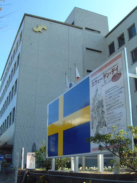 会議所会館前看板がスウェーデンバージョンに変身